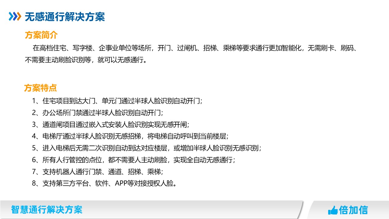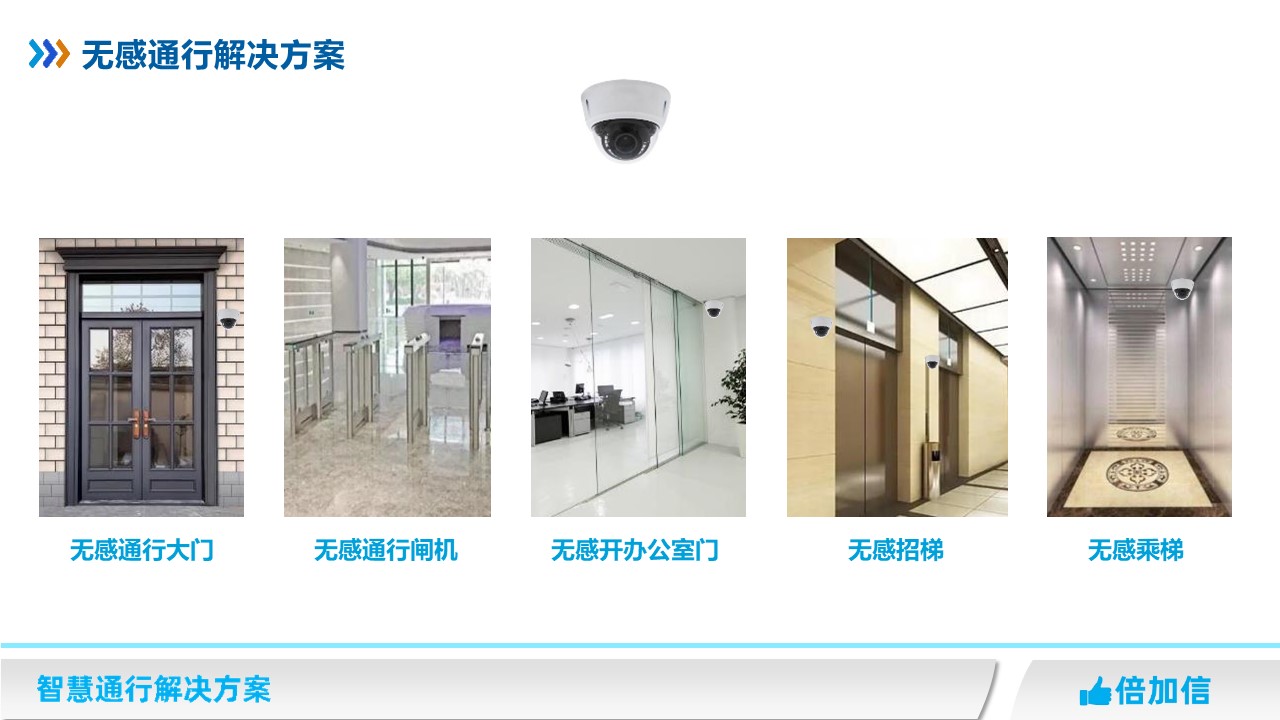在高檔住宅、寫字樓、企事業(yè)單位等場所,開門、過閘機(jī)、招梯、乘梯等要求通行更加智能化,無需刷卡、刷碼、不需要主動刷臉識別等,就可以無感通行。