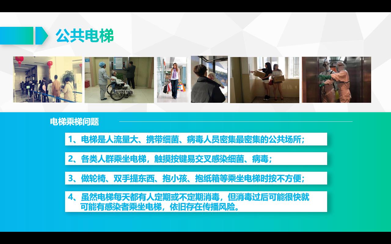 1、電梯是人流量大、攜帶細菌、病毒人員密集最密集的公共場所;