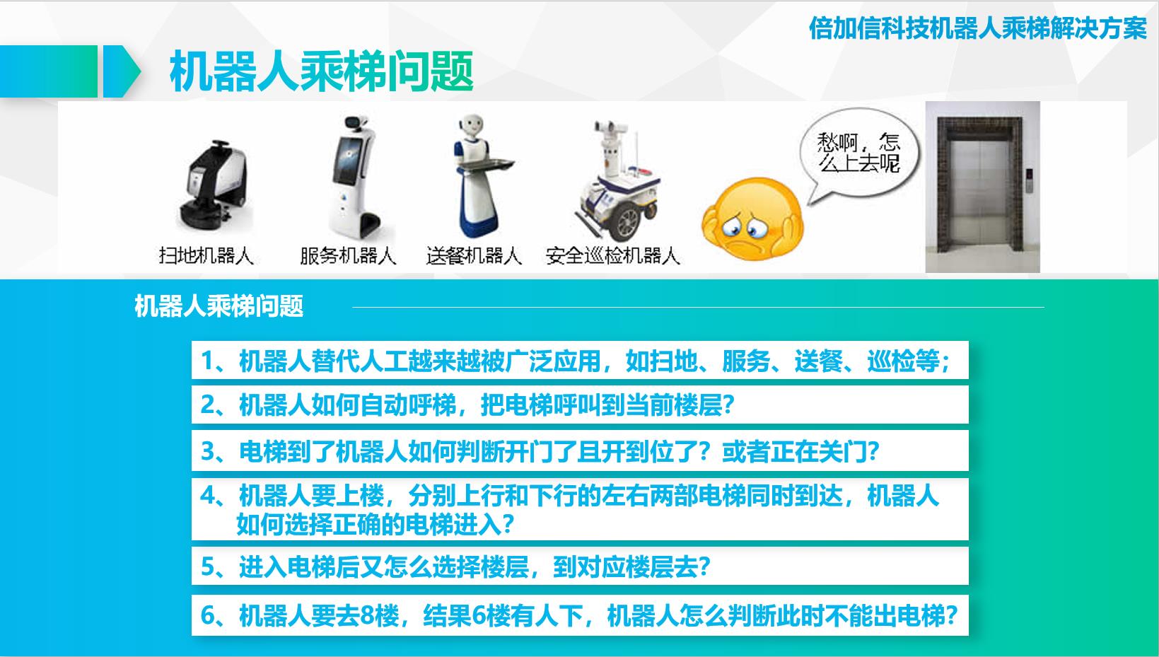 電梯呼梯:(1)機器人在電梯外,通個Wifi、藍牙、LoRa、Zigbee、2.4G、433M、語音或4G網絡等發送指令倍加信梯控系統,系統自動點亮上樓或下樓按鍵,實現呼