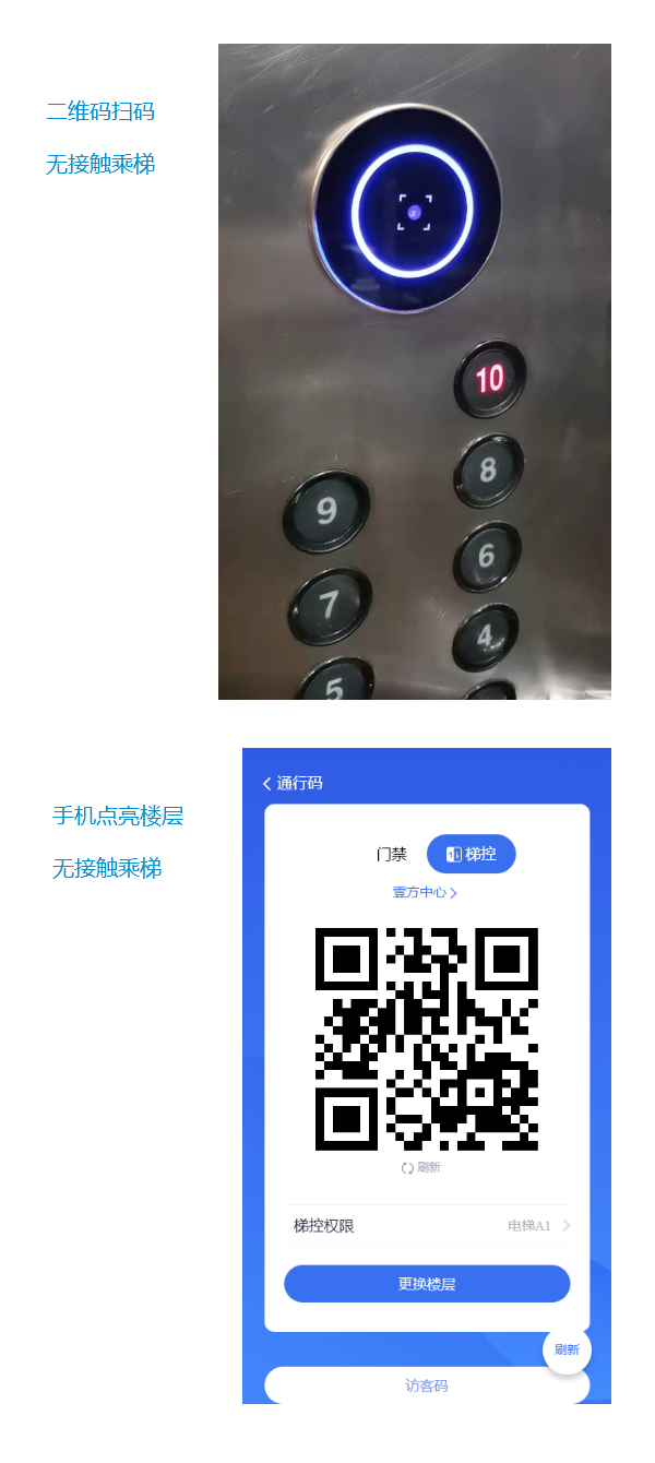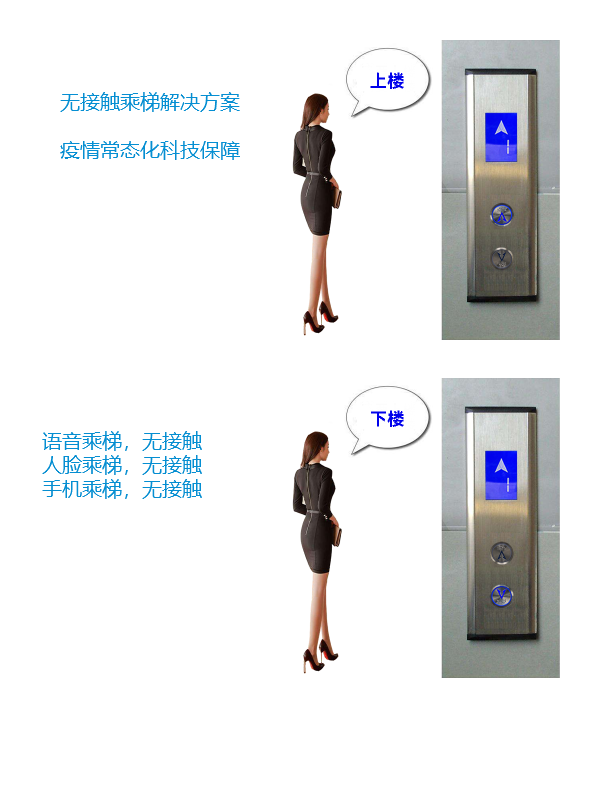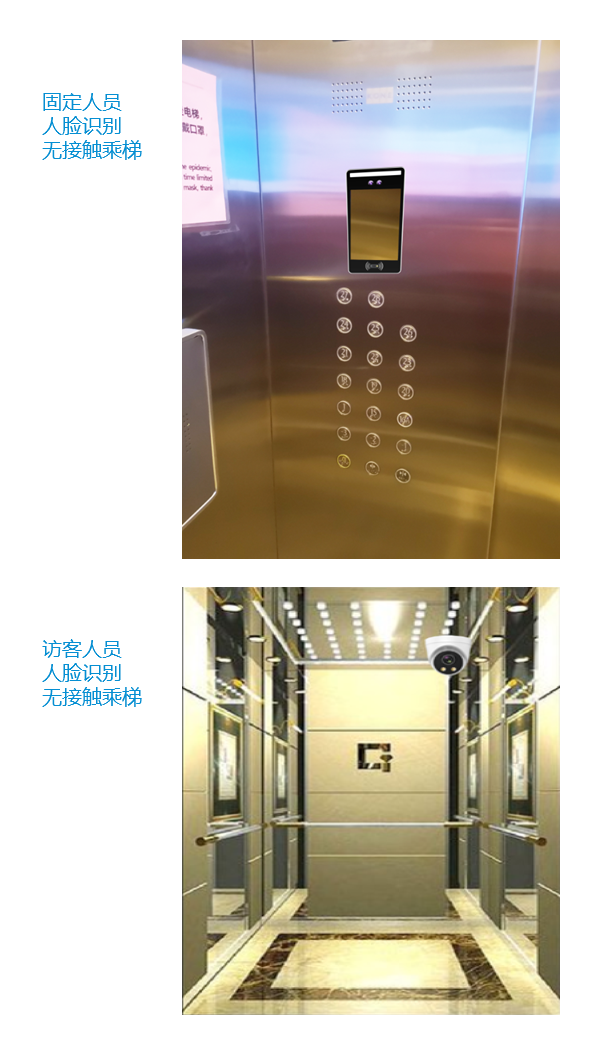 人臉無接觸乘梯:只需要人臉登記個人信息、刷臉即可實現無接觸乘梯通行,單個樓層刷臉自動點亮按鍵,多個樓層刷臉后手動按鍵,或者增加語音模塊,多個樓層權限刷臉后,直接語音乘梯,說無權限的樓層不會點亮按鍵,有權限的才能語音乘梯,公共樓層可直接語音乘梯。