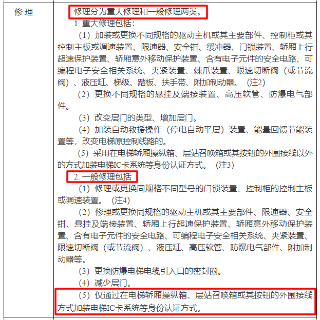 1. 重大修理包括:(5)采用在電梯轎廂操縱箱、層站召喚箱或其按鈕的外圍接線以外的方式加裝電梯IC卡系統(tǒng)等身份認證方式。